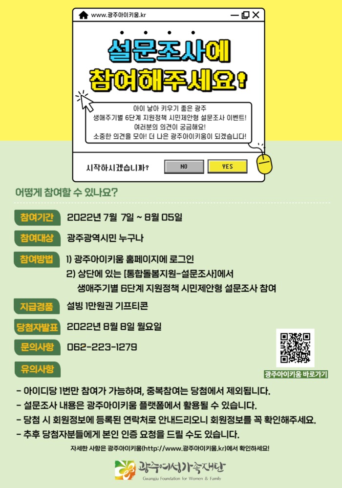 설문 참여는 광주아이키움 홈페이지 팝업창이나 상단 통합돌봄지원-설문조사 게시판에 작성하면 된다. 자세한 내용은 키움지원단으로 문의하면 된다.
