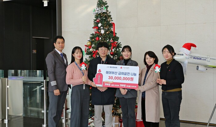 에어부산은 지난 27일 오후 에어부산 사옥에서 임직원 대표단과 부산사회복지공동모금회 관계자들이 참석한 가운데 ‘급여 끝전 모금액’ 전달식을 가졌다고 28일(목) 밝혔다.에어부산은 이날 전달식에서 올해 임직원들의 급여 끝전 모금액 약 1천5백만 원과 ‘매칭 그랜트’ 방식의 회사 출연금 약 1천5백만 원을 합쳐 총 3천만 원을 기부하였으며,기부금은 부산 지역의 난치병 아동 치료 및 발달장애 아동 자립 지원금으로 사용될 예정이다.