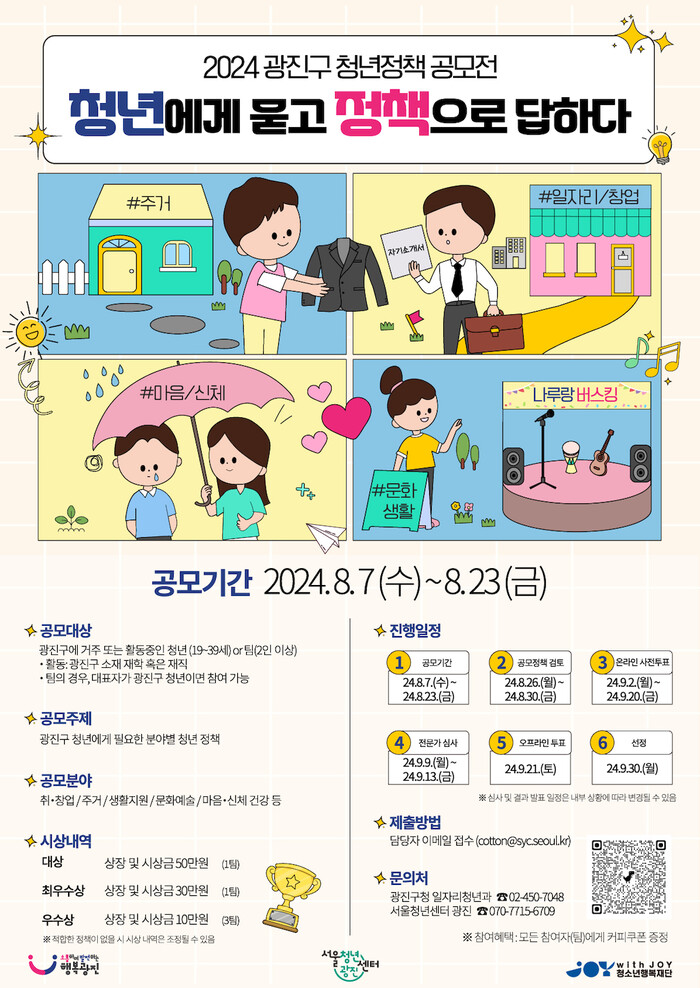 [시민일보 = 여영준 기자] 서울 광진구(구청장 김경호)가 청년의 날(9월21일)을 맞아, 광진구 청년에게 필요한 분야별 청년정책을 주제로 ‘2024년 청년정책 공모전’을 개최한다.