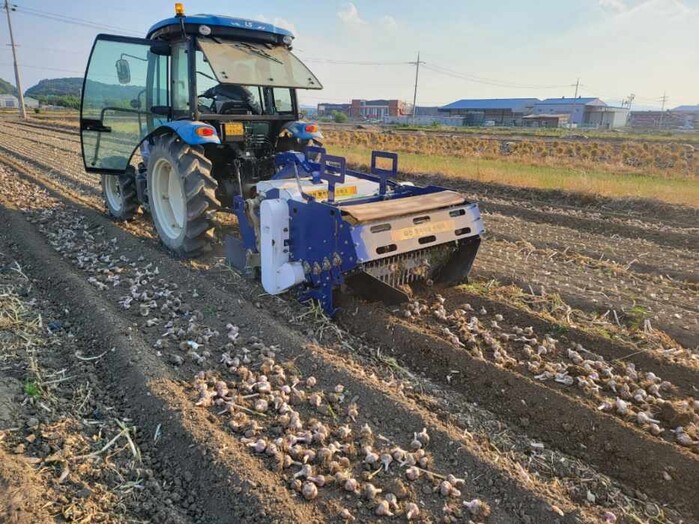 | ▲ 강진군으로부터 지원받은 마늘 수확 농기계를 통해 농작업을 하고 있는 농가 / 강진군 제공 |
