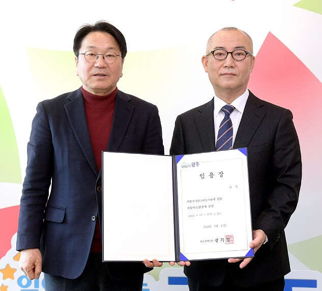 | ▲ 강기정 광주광역시장(왼 쪽)이 17일 오전 시청 3층 접견실에서 윤익 신임 시립미술관장에게 임명장을 수여한 후 기념촬영을 하고 있다. / 광주광역시 제공 |