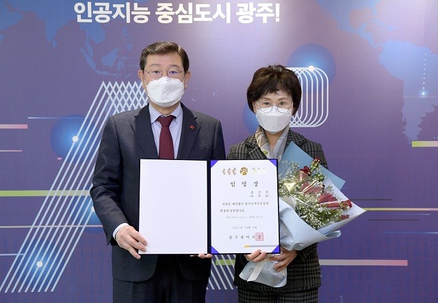 [광주=정찬남 기자] 광주광역시는 3일 오전 시청 접견실에서 임용장 수여식을 개최하고 광주디자인진흥원 제7대 원장으로 송진희 호남대 교수를 임명했다. 송진희 신임 원장이 이날부터 3년간의 공식 임기를 시작한다.