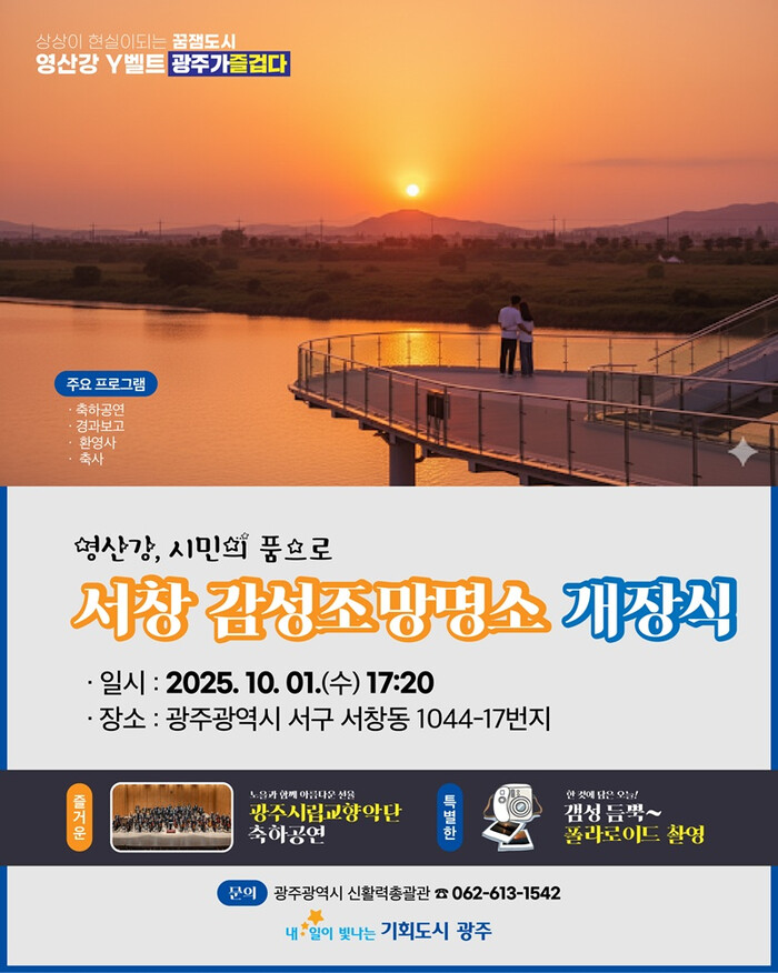 이승규 신활력추진본부장은 “서창 감성조망대는 시민과 관광객이 영산강의 아름다운 노을을 보며 감성과 문화를 함께 즐길 수 있는 공간”이라며 “서창 감성조망대가 광주의 대표 명소로 자리매김하길 기대한다”고 말했다.