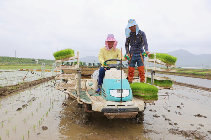 | ▲ 명현관 해남군수가 14일 계곡면 방춘리 들녘에서 열린 저탄소 벼 논물 보급사업 시범 논에서 이양기를 직접 시승해 모내기 작업을 하고 있다. / 사진=해남군 제공 |