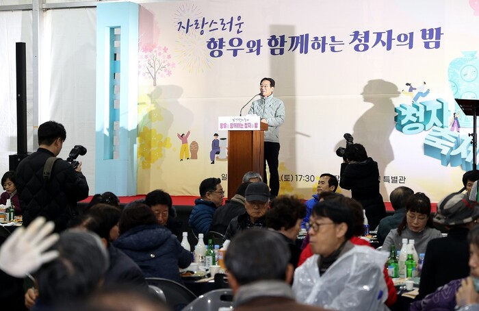 | ▲ 강진원 강진군수가 지난 24일 대구면 청자촌 축제현장에서 ‘향우와 함께하는 청자의 밤’ 만찬 행사를 주재하고 있다. / 강진군 제공 |
