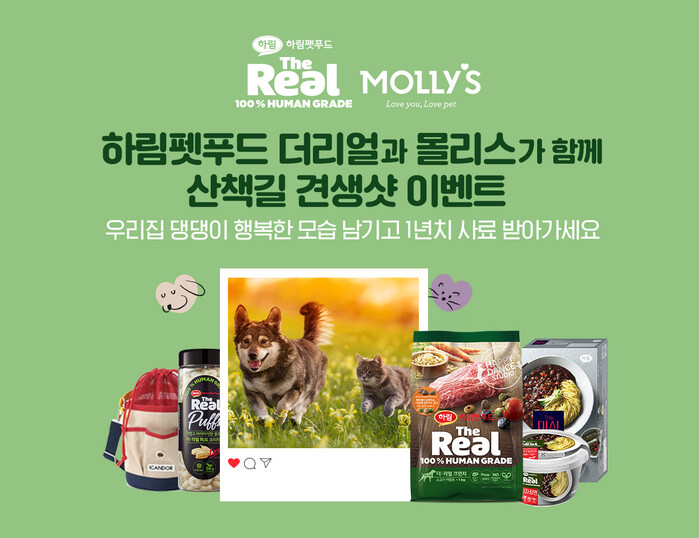 [시민일보 = 이창훈 기자] 하림펫푸드와 몰리스가 오는 7월7일까지 '이마트앱 견생샷 이벤트'를 개최하고 참여자들을 대상으로 ‘더리얼 1년치 사료’ 등 경품을 증정한다.