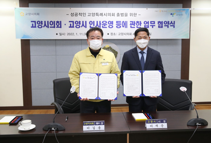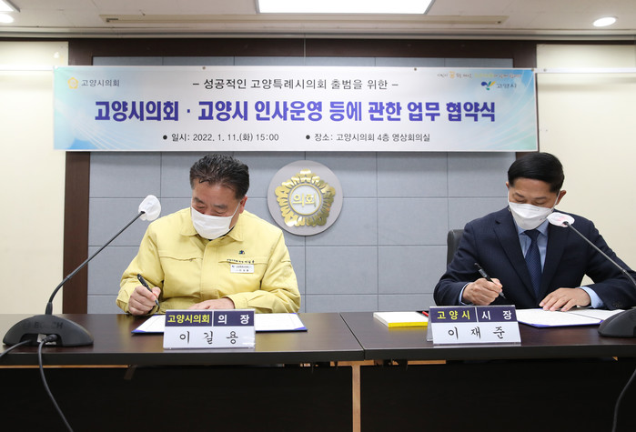 이날 협약식은 1월 11일 의회 4층 영상회의실에서 이길용 의장과 이재준 시장이 참석한 가운데 열렸으며, 지방자치법 전부 개정으로 지방의회 사무직원에 대한 인사 권한이 지방의회 의장에게 부여됨에 따라 차질 없는 업무 수행을 위한 근거를 마련하고 양 기관의 조화로운 업무 이관과 고양시의회 인사권 독립의 안정적 정착을 위해 이뤄졌다.