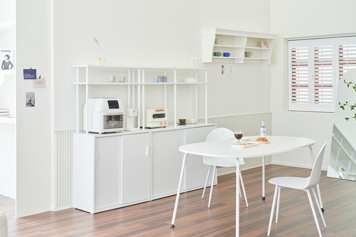 주방 수납장은 슬라이딩형으로 제작되어 문을 여닫기 위한 여유 공간이 필요하지 않아 공간을 보다 효율적으로 활용할 수 있다. 수납장 상부에는 시스템 선반을 설치해 전자레인지, 정수기, 커피 머신 등 부피가 큰 주방 기기를 올려 더 편리하게 사용할 수 있다.