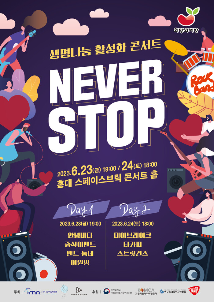 사단법인 인디뮤지션협회와 SBImusic, 스페이스브릭이 주최하고, 보건복지부 국립장기조직혈액관리원 및 사단법인 한국음악저작권협회, 한국음악실연자연합회가 후원하는 ‘생명나눔 활성화 콘서트-NEVER STOP’는 생명나눔으로 표현되는 장기·인체조직 기증에 대한 인식개선을 통해 생명나눔 문화의 국민적 확산에 기여하고 인류애를 도모하고자 하는 공익적 취지로 마련됐다.