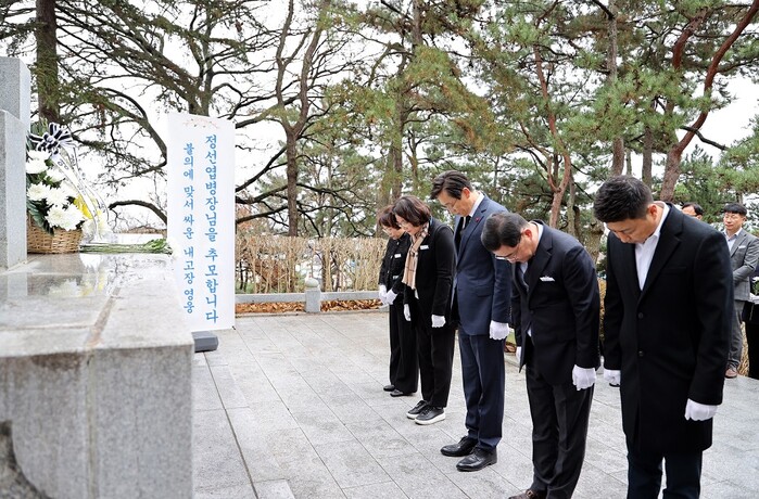 | ▲ 우승희 영암군(오른 쪽부터 3번)가 12일 영암공원 충혼탑에서 ‘내 고장 영웅 정선엽 병장 추모행사’에 참석해 헌화 묵념하고 있다. / 영암군 제공 |