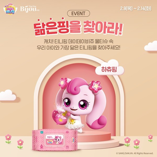 이번 이벤트는 인기 애니메이션 ‘알쏭달쏭 캐치! 티니핑’ 캐릭터와 디자인 협업한 ‘데이데이비쥬 캐치! 티니핑 물티슈’ 속 하츄핑, 나나핑, 꾸래핑, 솔찌핑 4명의 핑 중에서 우리 아이와 가장 닮은 핑을 찾아 인스타그램 스토리를 공유하거나 리그램하면 누구나 참여 가능하다.