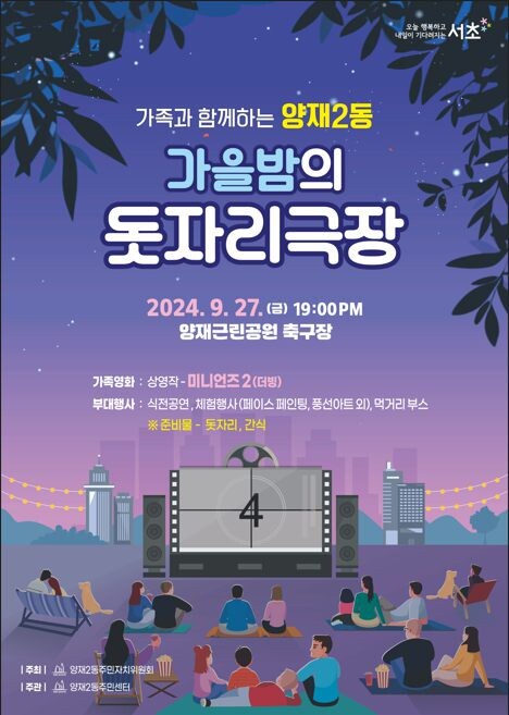 [시민일보 = 박소진 기자] 서울 서초구(구청장 전성수)가 가을을 맞아 주민들에게 시원한 바람과 즐거운 추억을 선사할 ‘가을밤의 돗자리극장’을 27일 오후 7시 양재2동 양재근린공원 축구장에서 연다.