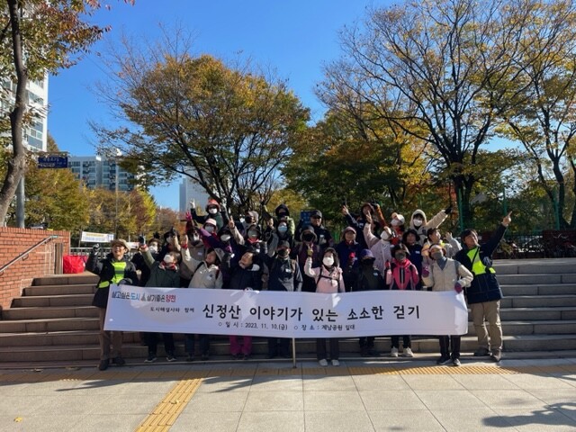 | ▲ 지난 2023년 진행된 ‘신정산 따라 소소한 걷기’ 참여자들이 기념 촬영하고 있다. (사진=양천구청 제공) |