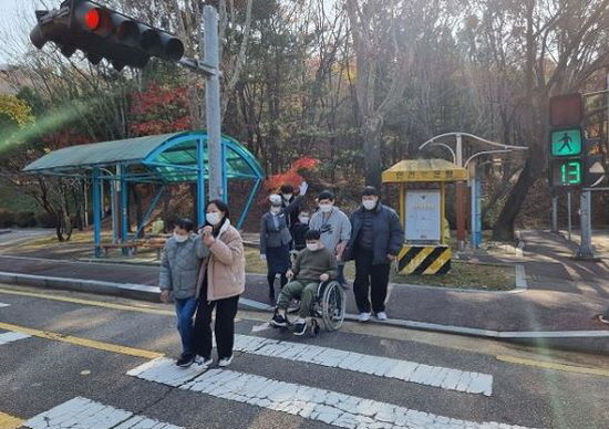 | 발달장애인들이 실외 횡단보도를 안전하게 건너는 방법을 실습하고 있다. (사진=부천도시공사) |