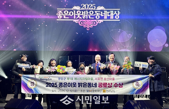 | ▲ 영암군 송산마을, 지난 12일 광주광역시 조선대학교 해오름관에서 열린 ‘2025 좋은이웃 밝은동네 대상' 시상식에서 공로상 수상 기념촬영 / 영암군 제공 |