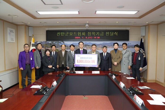 [신안=황승순 기자]신안군요트협회(회장 이승호) 회원들이 지난 3일 지역 학생들을 위한 장학기금 5백만 원을 신안군장학재단(이사장 박우량)에 전달했다고 밝혔다.