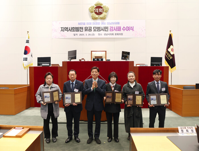 [성남=오왕석 기자] 성남시의회는 28일 본회의장에서 지역사회발전 모범시민 감사패 수여식을 개최했다. 이번 행사는 지역사회를 위해 헌신해 온 시민들에게 감사의 마음을 전하고, 그 노고를 격려하기 위해 마련됐다.