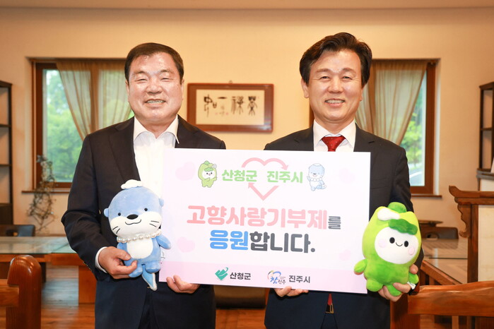 지난 29일 산청군 신안면에서 개최된 ‘진주-산청 경제분야 간담회’에서 진주시와 산청군은 고향사랑기부금 상호 기탁식을 가졌다. 이날 진주시는 산청군에 1000만 원을, 산청군은 진주시에 700만 원을 전달하며 서로를 향한 애틋한 마음을 전했다.