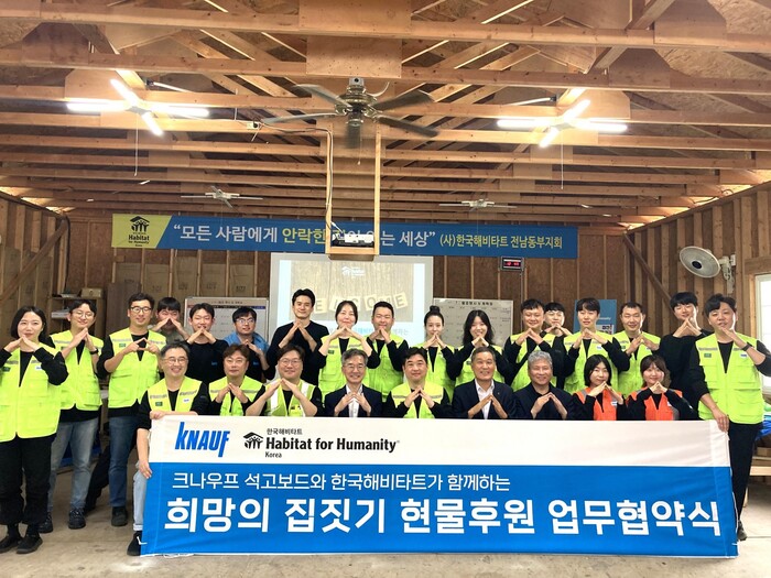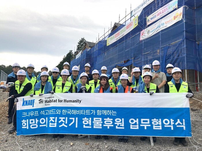 글로벌 건축자재 선도기업 크나우프 석고보드㈜는 한국해비타트 ‘희망의 집짓기’ 현장에서 석고보드 시공 및 마감 등의 건축봉사에 참여하고 전국 건축 현장에 필요한 석고보드를 전량 후원하는 업무 협약식을 지난 9월 19일 전남 광양시 우산리에서 진행했다.