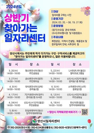 양산시 관계자는 “찾아가는 일자리센터를 통해 숨은 구직자를 파악하고, 취업 사각지대에 놓인 구직자들에게 맞춤형 취업지원 서비스를 제공함으로써 구인·구직자간 미스매치를 최소화할 수 있도록 지속적인 노력을 기울이겠다”며 “수시 운영 중인 채용한DAY! 취직한DAY!, 올해 11월 중 개최 예정인 채용박람회 등 오프라인 채용행사에도 많은 관심과 참여를 부탁드린다”고 밝혔다.