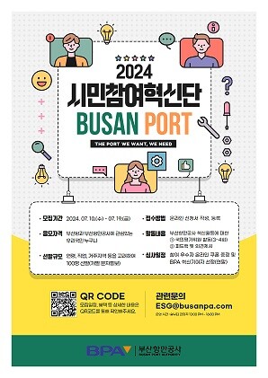 BPA는 2024년 새롭게 운영하는 부산항 시민참여혁신단 규모를 연령, 직업, 거주지 등을 고려해 100명 규모로 선발할 예정이며, 7월 10일(수)부터 7월 19일(금)까지 모집한다.