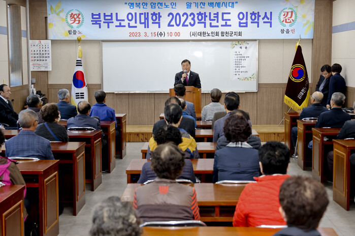 올해 북부노인대학 입학식은 가야, 야로 묘산지역 3개 면의 어르신들이 입학했으며, 총 55명으로 구성됐다.