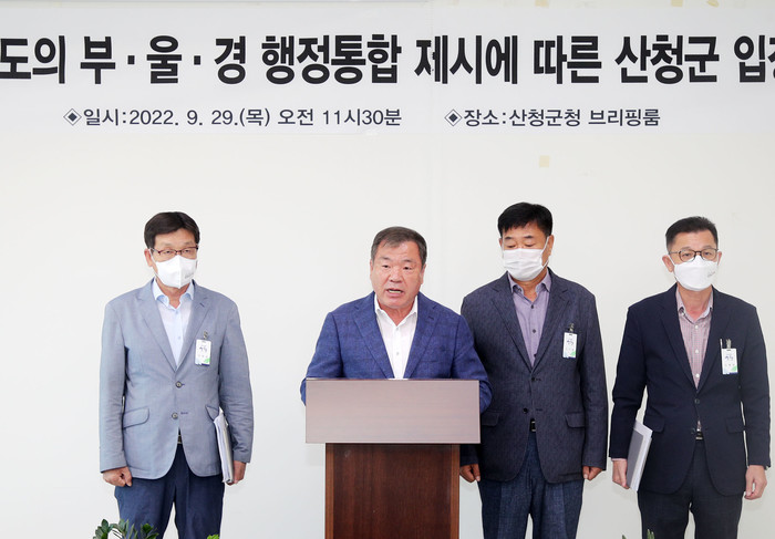 이승화 군수는 29일 산청군청 브리핑룸에서 기자회견을 열고 “박완수 도지사의 부울경 메가시티 중단 선언과 부울경 행정통합 제안에 대해 환영의 뜻을 밝힌다”고 말했다.