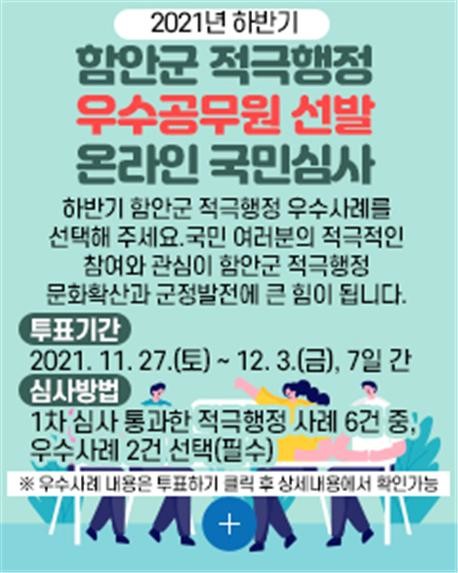함안군은 2021 하반기 적극행정 우수공무원 선발을 위해 온라인 투표를 실시한다고 밝혔다. 이번 선발은 코로나19로 어려운 시기에 적극적으로 업무를 수행하여 주민의 편익을 위해 노력한 공무원을 선발하기 위해 마련됐다.
