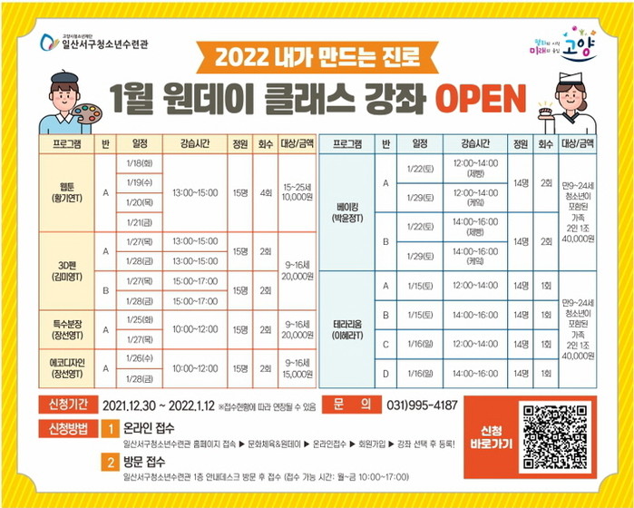 클래스 접수는 2021년 12월 30일부터 2022년 1월 12일까지 일산서구청소년수련관 홈페이지와 수련관 방문을 통해 가능하며, 자세한 사항은 일산서구청소년수련관 홈페이지 공지사항 ‘원데이클래스 현황’에서 확인할 수 있다.