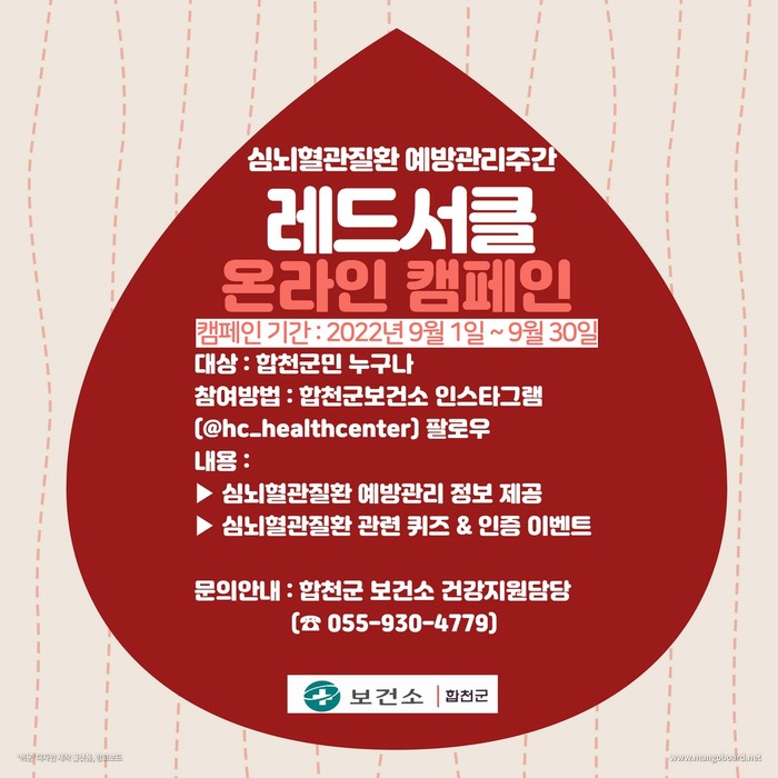 공식 소셜 미디어(합천군보건소 인스타그램)를 이용한 온라인 캠페인은 심뇌혈관질환에 관한 콘텐츠 제공 및 퀴즈와 인증 이벤트 등을 진행해 심뇌혈관질환에 대한 지식습득의 기회 제공과 예방수칙 실천율 향상을 목적으로 시행된다.
