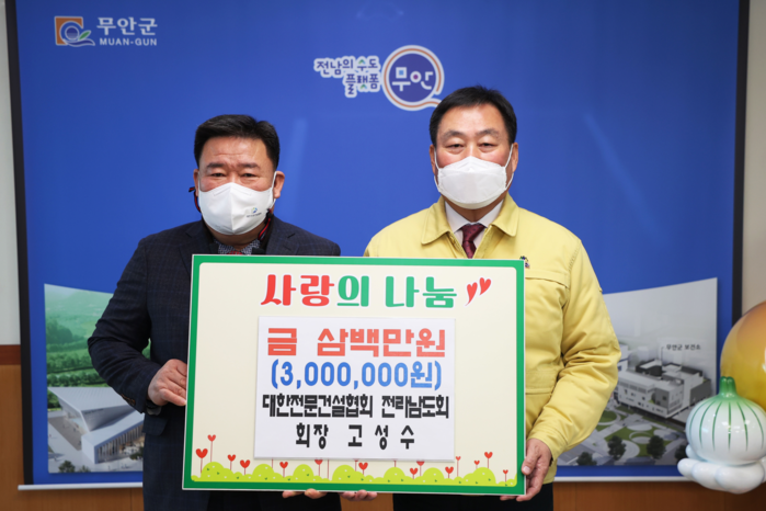 | ▲ 대한전문건설협회 전라남도회 고성수 회장, 무안군에 성금 300만원 기탁. (출처=무안군청) |