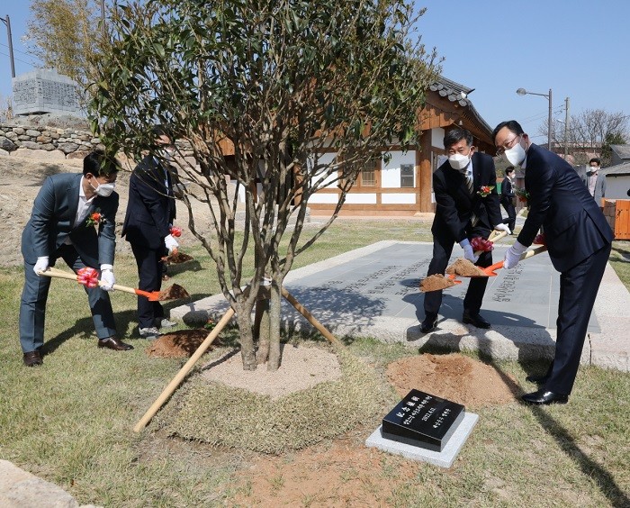 | ▲ 명현관 해남군수(우측)가 곽준길 부군수 및 관계자 등과 함께 법정스님 마을도서관 개관 기념 식수에 토삽 기념촬영을 하고 있다. / 사진=해남군 제공 |