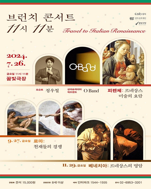 도슨트 정우철의 쉽고 재미있는 설명과 함께 싱어송라이터 재즈밴드인 O Band가 선보이는 재즈 선율은 관객으로 하여금 르네상스 시대를 살고 있는 것 같은 생생한 느낌을 선사할 것으로 기대하고 있다.