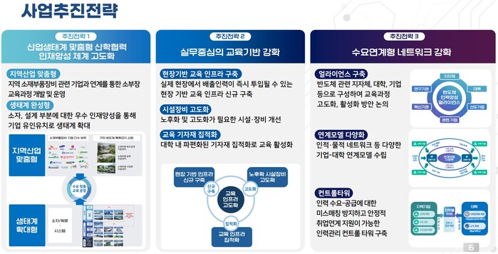지역기업 수요를 기반으로 ▲특성화 교육과정 개발과 운영 ▲교육 및 실습환경 구축 ▲반도체 분야 취업ㆍ진학(대학원) 활성화 등 산학 일체형 소재ㆍ부품 인력 양성 생태계 구축이 핵심이며, 4년간 1500명의 인재 양성을 위한 국비 280억원을 지원받는다.