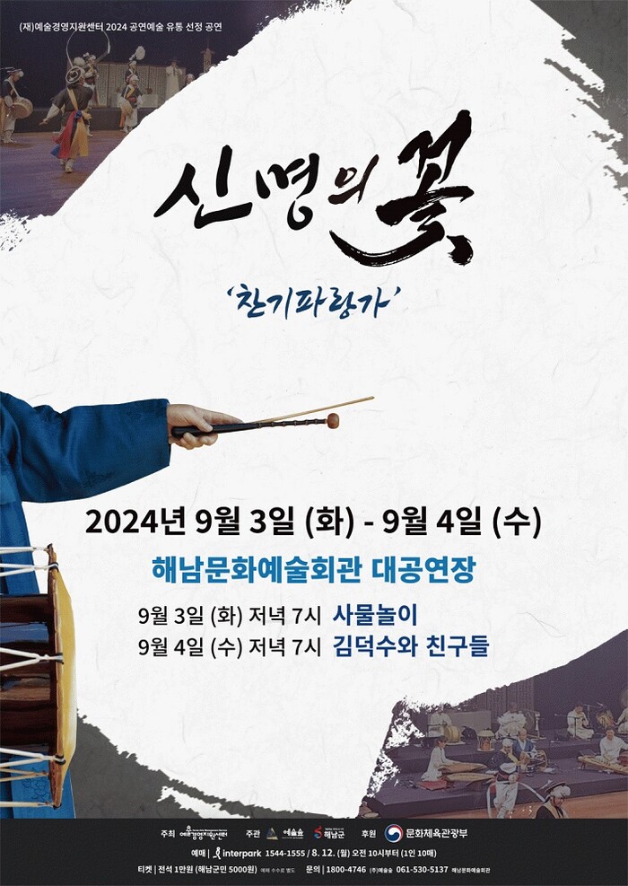 이번 공연은 문화체육관광부 예술경영지원센터 주관 공모사업에 선정돼 국비를 지원받아 열린다. 김덕수패 사물놀이와 최고의 기량을 갖춘 예인들이 참여해 다양한 악기들이 조화를 이룬 우리 음악을 선보일 예정이다.