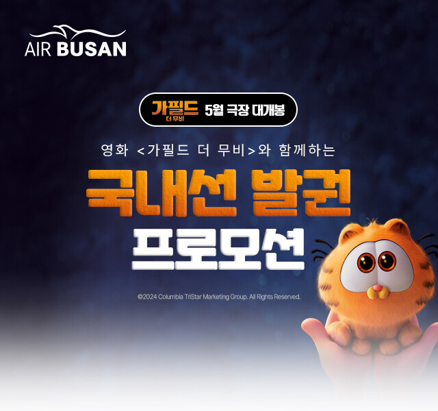 에어부산은 오는 5월 개봉 예정인 영화 <가필드 더 무비>와 함께 국내선 발권 프로모션을 실시한다. 이번 프로모션 항공권은 국내선 전 노선 대상 편도 총액 운임(유류할증료 및 공항세 포함) 기준 27,000원부터 에어부산 홈페이지 및 모바일 웹·앱을 통해 판매된다. 프로모션은 4월 24일 오전 11시부터 5월 12일까지 진행되며, 프로모션 항공권의 탑승 기간은 4월 24일부터 7월 31일까지다.