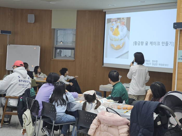 행사는 도농복합도시인 용인의 특성을 반영해 지역 농업인을 강사를 초빙, 원삼면에서 재배한 귤과 용인에서 채취한 쑥을 배합한 크림치즈, 쌀가루를 이용한 빵으로 만든 케이크 등 지역 농산물을 사용한 케이크를 만드는 내용으로 진행됐다.