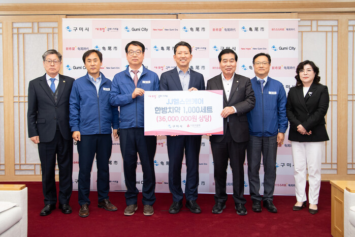 [구미=박병상 기자] 경북 구미시(시장 김장호)는 22일(수) 16시 국제통상협력실에서 JJ헬스앤케어 장재권 대표와 임원진, 안주찬 시의장이 참석한 가운데 건강케어제품 1,000세트(36백만원상당)를 전달하는 기탁식을 가졌다.