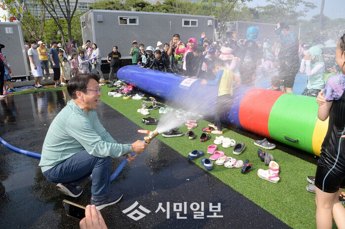 | ▲ 강기정 광주광역시장이 지난 2024년 5월 25 제59회 광주시민의 날 행사에서 어린이들과 물놀이를 하고 있다. / 광주광역시 제공 |