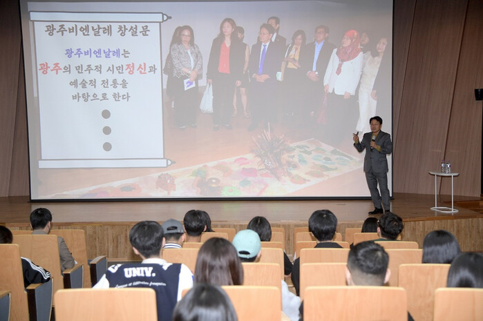 | ▲ 강기정 광주광역시장이 지난 28일 오후 전남대학교 공과대학 4호관 코스모스홀에서 시정 주요정책 및 계획에 대해 강연을 하고 있다. /광주광역시 제공 |