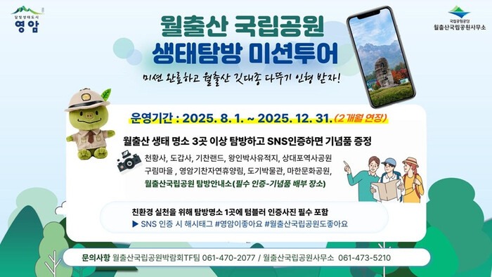 미션이 있는 이 투어는 월출산국립공원을 찾는 모든 관광객들이 참여할 수 있는 프로그램으로, 영암 생태탐방 명소를 3곳 이상 방문하거나, 2곳 방문 및 체험·숙박·구매 영수증 1매 이상 제출하면 된다.