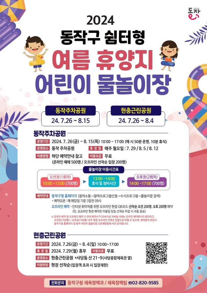 물놀이장은 동작주차공원(동작역 5번 출구)과 현충근린공원(사당종합체육관 옆) 2곳으로 매일 오전 10시부터 오후 5시까지 운영한다. 시설 정비와 관리 등을 위해 매주 월요일은 휴장한다.