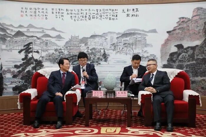 | ▲ 강진원 강진군수(왼 쪽)가 지난 10월 30일 중국 용천시 용천청자박물관를 방문해 왕국봉 용천시장과 ,강진군 청자산업 교류 활성화 및 자매도시간 우호교류 증진 등 업무협약과 관련한 대화를 나누고 있다. / 강진군 제공 |