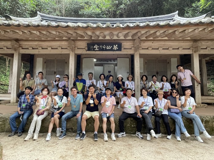 | ▲ 강진군이 실시하는 "2022년 다산청렴교육 상반기 교육"과정에 참여한 공직자들이 다산초당을 방문해 기념촬영을 하고 있다. / 사진=강진군 제공 |