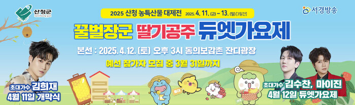 [산청=이영수 기자] 경남 산청군은 오는 4월11일부터 13일까지 동의보감촌에서 개최하는 2025 산청농특산물 대제전에서 열리는 ‘꿀벌장군 딸기공주 듀엣가요제’의 참가자를 모집한다고 23일 밝혔다.