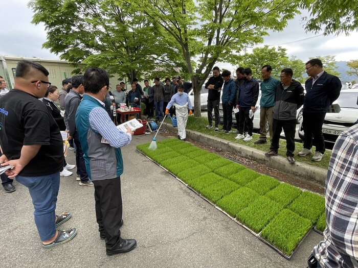 영암군농업기술센터는 수도작 시범사업 참여 농가의 시행착오를 줄이기 위해 동영상을 상영하고, 현장 시연도 진행하며 농업인들의 신기술 교육을 지원하고 있다.