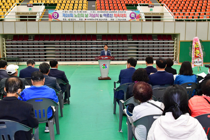 [양산=최성일 기자] (사)대한노인회 양산시지회(지회장 서춘계)는 지난 18일 양산시 종합운동장 실내체육관에서‘제26회 노인의 날 기념식 및 어르신 체육대회’를 개최했다.