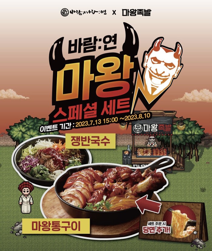 ▲바람:연 마왕 스페셜 세트는 마왕족발의 베스트 메뉴만 모아 만든 특별한 세트로 마왕통구이(소) + 당면추가 + 쟁반국수로 구성되어 있으며, 이벤트 기간 동안 마왕족발에서 ‘바람:연 스페셜 세트’ 구매 시, 게임에서 사용할 수 있는 ‘마왕 스페셜 쿠폰’을 증정한다.