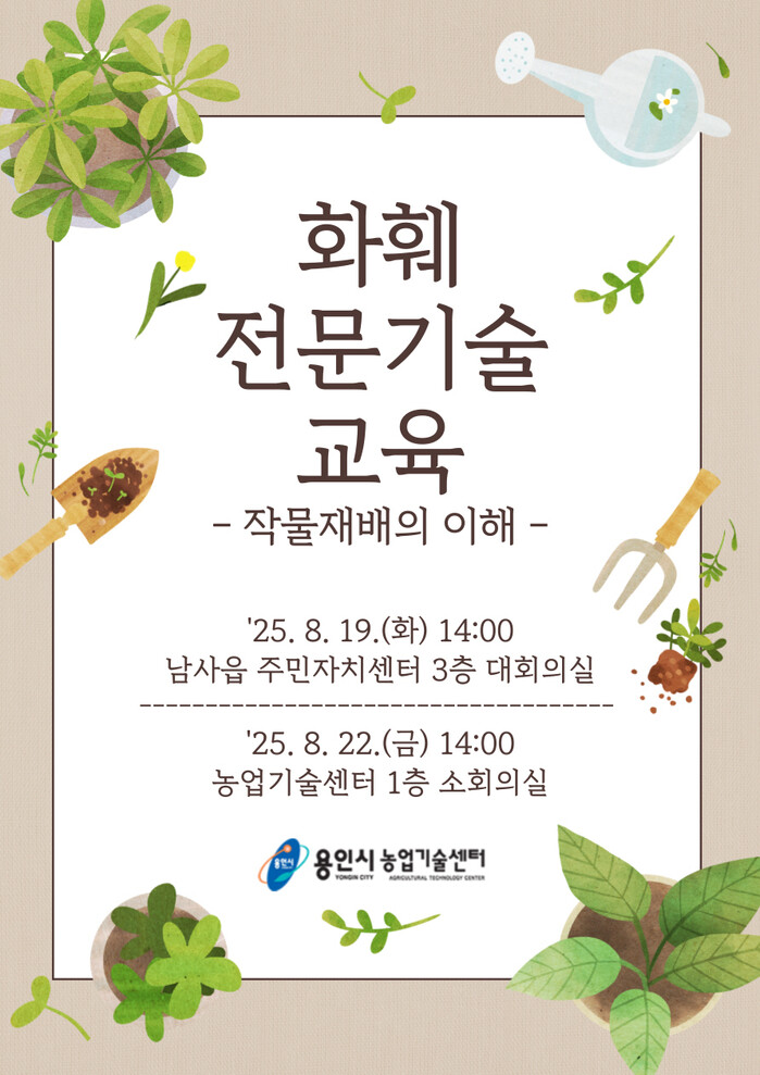 교육은 ▲8월 19일 남사읍 주민자치센터 3층 대회의실 ▲8월 22일 원삼면 농업기술센터 1층 소회의실에서 진행되며, 동일한 강의 내용과 강사진으로 2회 운영된다.