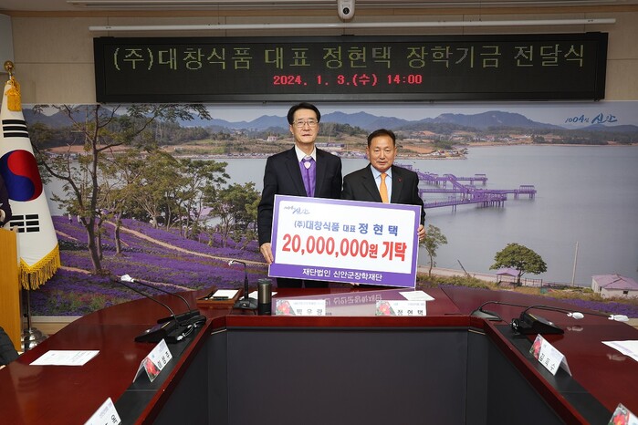 [신안=황승순 기자]신안군장학재단(이사장 박우량)은 지난 3일 ㈜대창식품 정현택 대표가 신안군청을 방문하여 고향 후배들의 학업을 위해 써 달라며 2천만 원을 기탁했다고 밝혔다.